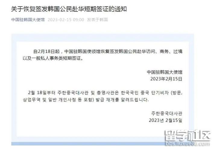 中國駐韓國大使館同日發(fā)布通知稱,自2月18日起,中國駐韓國使領(lǐng)館恢復(fù)簽發(fā)韓國公民赴華訪問、商務(wù)、過境以及一般私人事務(wù)類短期簽證。