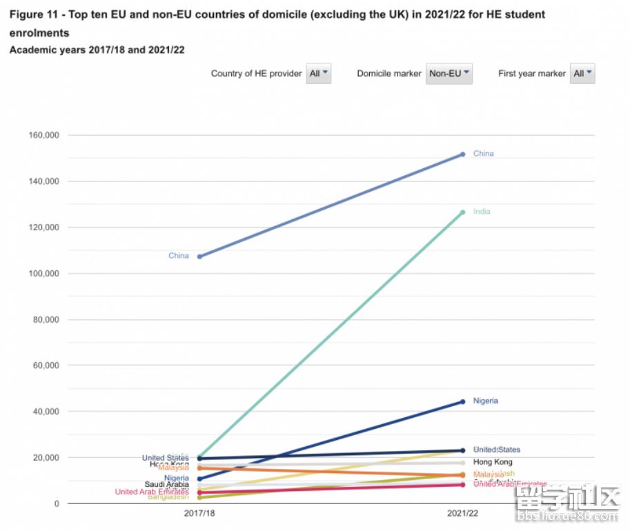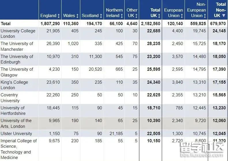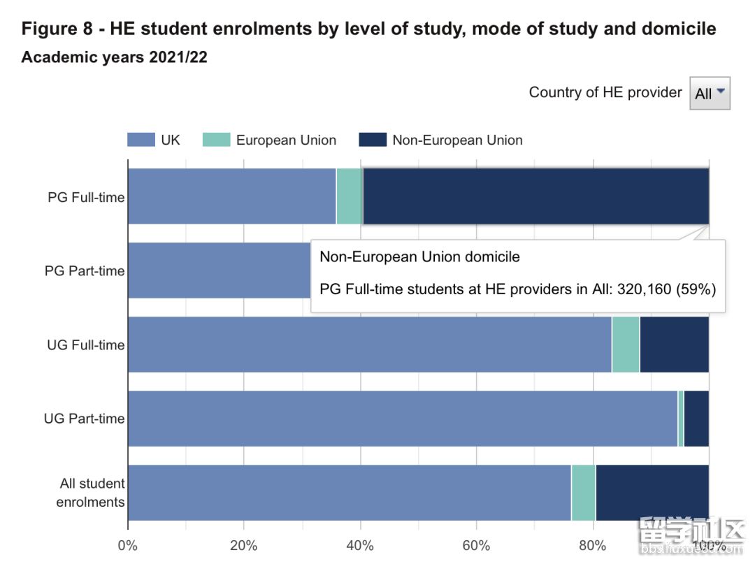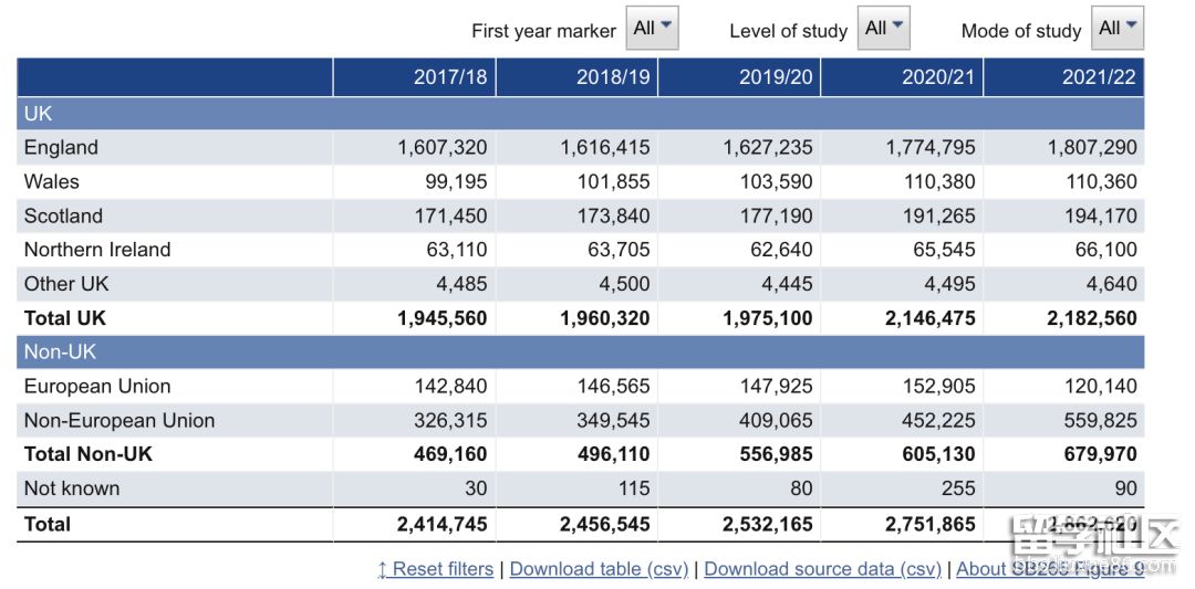 在2021/22學(xué)年,英國總共接收了679970名非英國學(xué)生,占英國大學(xué)生總數(shù)的24%(數(shù)據(jù)涉及2021年8月1日至2022年7月31日期間入學(xué)的學(xué)生)。