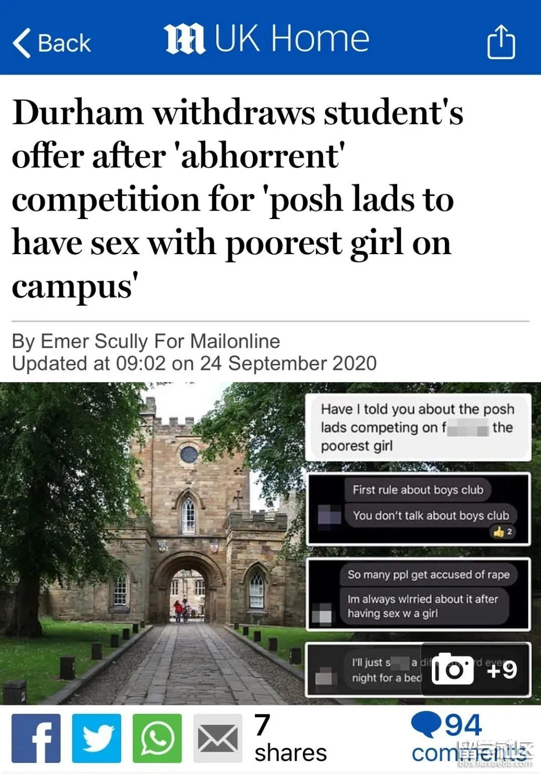 再有,2020年杜倫大學(xué)的一名新生在社群中公然討論“泡妹比賽”,在對這名學(xué)生令人“極其厭惡”的言論進行調(diào)查后,杜倫大學(xué)收回了錄取的offer。