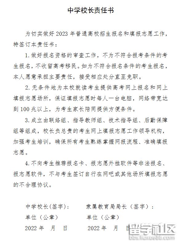 各中學(xué)校長(zhǎng)要與所屬教育局局長(zhǎng)簽訂《中學(xué)校長(zhǎng)責(zé)任書(shū)》(附件,以下簡(jiǎn)稱(chēng)責(zé)任書(shū))?!敦?zé)任書(shū)》由中學(xué)所在旗縣教育招生考試機(jī)構(gòu)在報(bào)名前通過(guò)報(bào)名系統(tǒng)照拍上傳,自治區(qū)教育招生考試中心據(jù)此確定符合報(bào)名工作條件的中學(xué)名單;未簽訂《責(zé)任書(shū)》的中學(xué),取消組織報(bào)名資格。各中學(xué)要提前做好宣傳培訓(xùn),并組織本校學(xué)生進(jìn)行網(wǎng)上預(yù)報(bào)名。