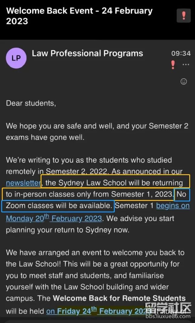 悉尼大學(xué)法學(xué)院在一封發(fā)給學(xué)院學(xué)生的郵件中明確表示,從2023年S1開(kāi)始,即不再提供網(wǎng)課,所有課程全面回歸線(xiàn)下,in-person classes only!