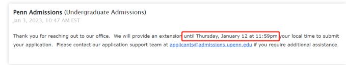 申請賓大的同學也有收到學校發(fā)來的延期申請截止日期的回應郵件:考慮到中國疫情的影響,學校給中國申請者提供額外的支持,將RD的申請截止日期延期至2023年1月12日(星期四)晚上11:59(申請人當?shù)貢r間)。