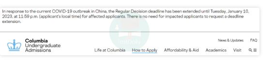 此外,哥倫比亞大學官網(wǎng)也發(fā)布消息:考慮到中國CoviD-19疫情的爆發(fā),受影響申請人的RD截止日期已延長至2023年1月10日(星期二)晚上11:59(申請人當?shù)貢r間)。受影響的申請人無需請求延期截止日期。
