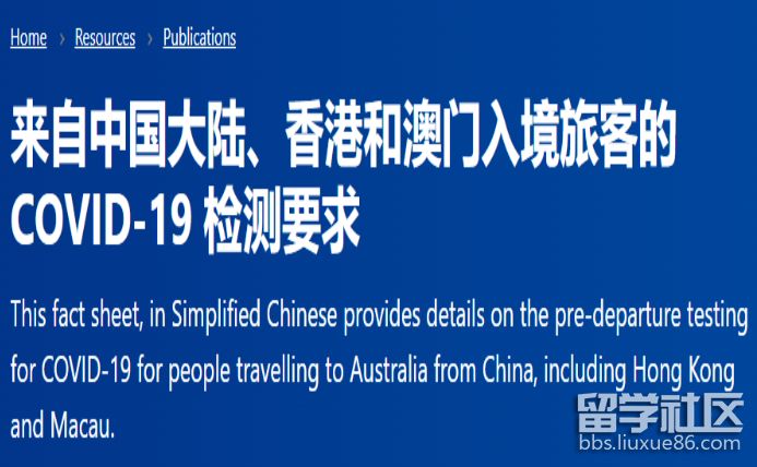 澳大利亞政府宣布最新的入境要求:來自中華人民共和國(包括香港和澳門特別行政區(qū))的旅行者,必須提交在旅行前48小時內進行的COVID-19測試的陰性證明。