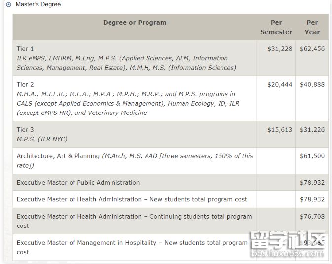 以康奈爾大學(xué)(Cornell University,簡(jiǎn)稱Cornell )的碩士項(xiàng)目為例,常申的理工科和文商科碩士項(xiàng)目一年的學(xué)費(fèi)分別約在$31000~$63000之間。