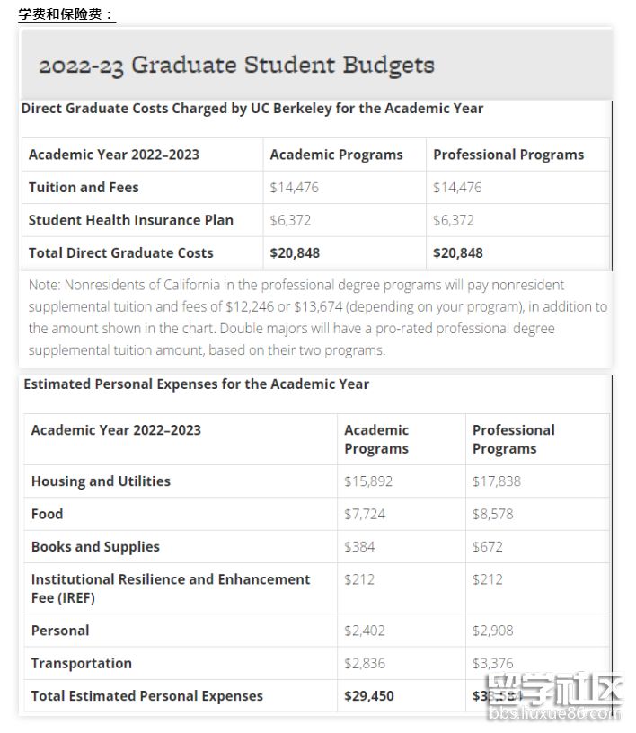 以加州大學(xué)伯克利分校(UCB)碩士項(xiàng)目為例,一年的總費(fèi)用包括學(xué)費(fèi)(國(guó)際生需要另繳補(bǔ)充學(xué)費(fèi))、保險(xiǎn)費(fèi)和生活費(fèi)。
