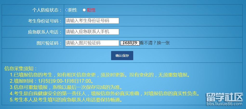 請考生提前申領(lǐng)山東省電子健康通行碼,考生需于1月5日—6日進行1次核酸檢測。為確保及時得到核酸檢測結(jié)果,避免核酸檢測未出結(jié)果影響信息填報,考生原則上應(yīng)于1月5日進行核酸檢測。完成核酸檢測后,請所有考生務(wù)必于1月5日9:00至1月6日17:00登錄網(wǎng)站https://wsbm.sdzk.cn:8888/tlxxtb/,如實填報個人健康信息,我們將根據(jù)考生填報健康信息進行分類編場。若個人健康信息填報時,考生已確認在陽性感染期內(nèi),則無需進行核酸檢測,請直接如實填報個人健康信息即可。若考生屬于正在醫(yī)療機構(gòu)接受救治的新冠感染重癥患者,可與報名地縣級教育招生考試機構(gòu)聯(lián)系落實參加考試事宜。
