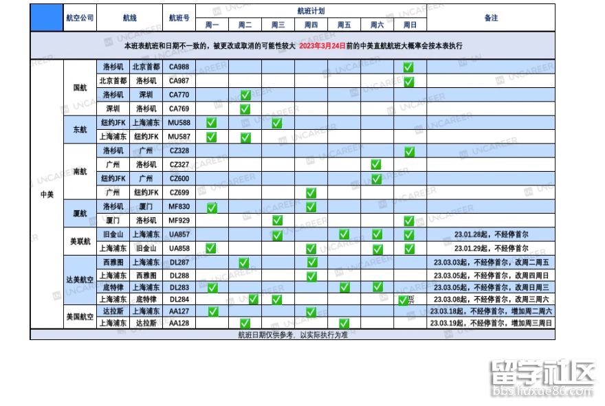獨(dú)家匯總了目前中美目前國(guó)內(nèi)外所有航班的信息,23年3月24日之前航班將會(huì)按照下表執(zhí)行!