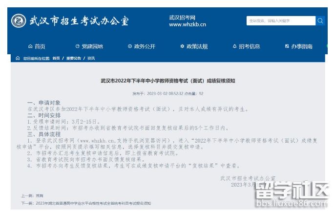 3月1日,武漢市招生考試辦公室發(fā)布2022年下半年中小學教師資格考試(面試)成績復核須知。3月2日至15日,在武漢考區(qū)參加2022年下半年中小學教師資格考試(面試),且對本人成績有異議的考生可申請成績復核。武漢市招考辦收到湖北省教育考試院書面回復復核結果后的5個工作日內,將反饋結果。