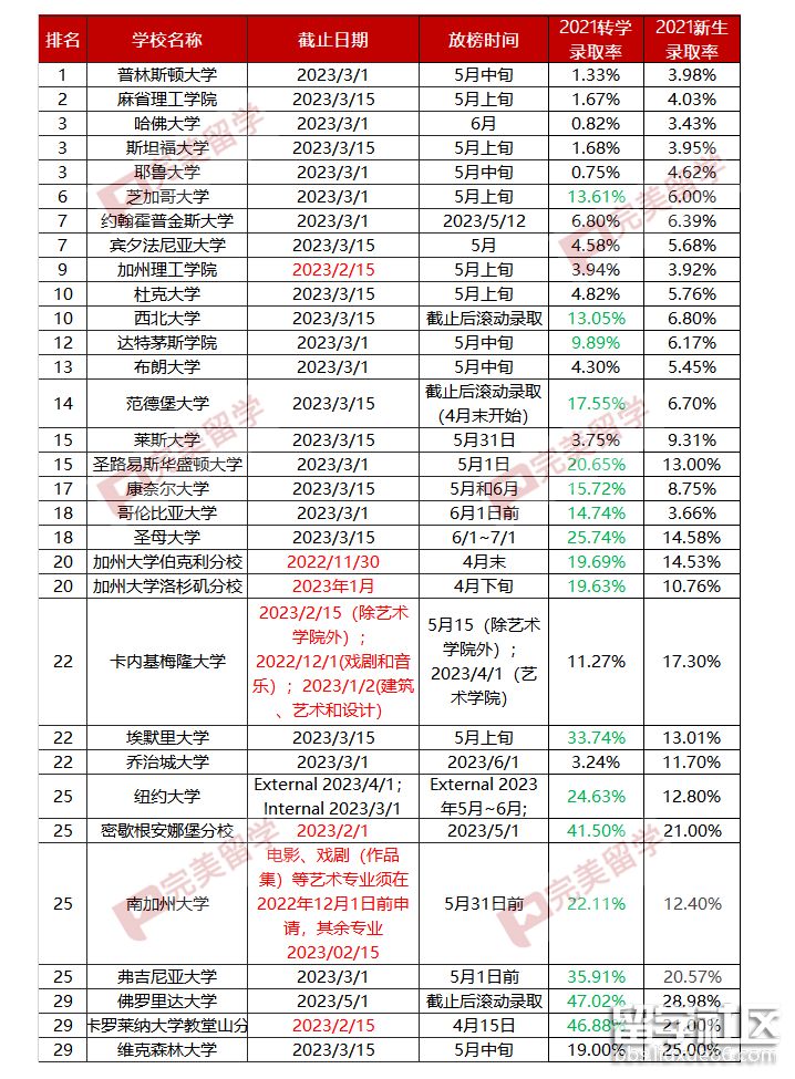 隨著3月份的到來(lái),2023年美本秋季入學(xué)轉(zhuǎn)學(xué)申請(qǐng)也即將截止,很多學(xué)生都期待轉(zhuǎn)學(xué)能給自己帶來(lái)一次飛躍,為了方便同學(xué)們查收offer,完美留學(xué)給大家匯總了TOP30美國(guó)大學(xué)轉(zhuǎn)學(xué)申請(qǐng)截止時(shí)間和放榜時(shí)間匯總,大家可以收藏下。