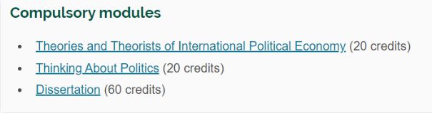 選修課則包括全球化、可持續(xù)化、環(huán)境政治,貧困和發(fā)展以及性別問題、安全和戰(zhàn)爭(zhēng)等模塊。