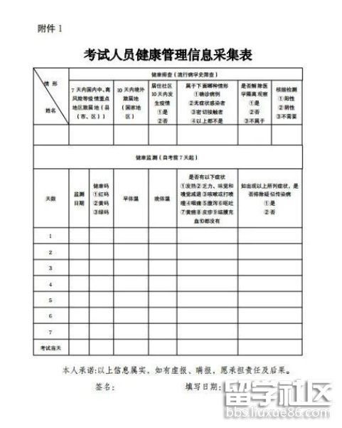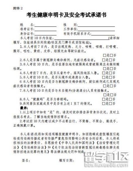 (三)認真做好考前7天健康監(jiān)測。按照《山東省新冠肺炎疫情常態(tài)化防控期間考試防控指南(第三版)》要求,考生自考前7天起每天采取自查自報方式進行健康監(jiān)測,早、晚各進行1次體溫測量,如實填寫《考試人員健康管理信息采集表》(見附件1)。請考生提前了解健康承諾書內(nèi)容,按要求如實簽訂《考生健康申明卡及安全考試承諾書》(見附件2),考前主動減少外出、不必要的聚集和人員接觸,確??荚嚂r身體狀況良好。