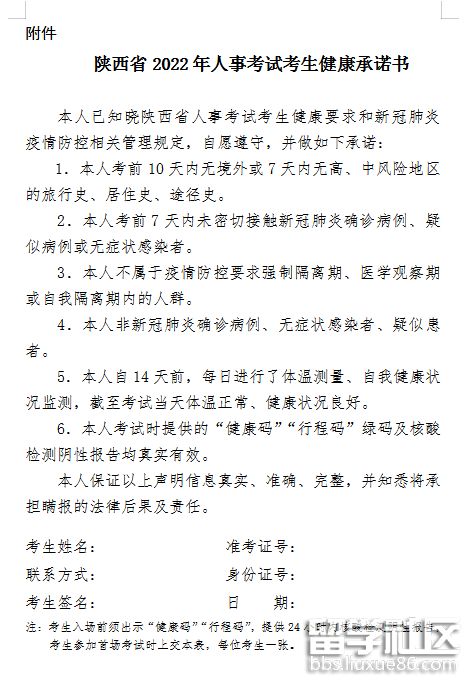 二、考生須提前14天以上申領(lǐng)“陜西一碼通”(健康碼)和“通信大數(shù)據(jù)行程卡”(行程碼),并下載打印《陜西省2022年人事考試考生健康承諾書》(附件,以下簡稱《健康承諾書》,參加本人首場科目考試時上交),做好備考期間個人日常防護和考前14天自主健康監(jiān)測,按要求如實、完整填寫《健康承諾書》相關(guān)信息并確認簽字。