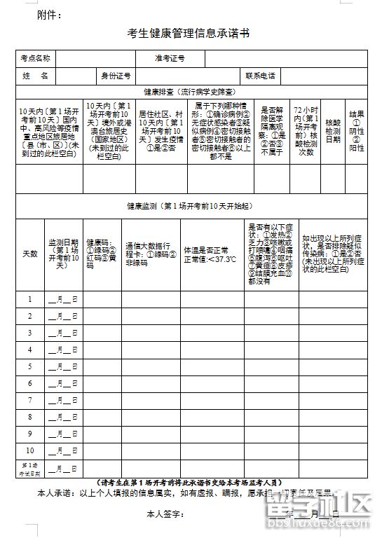 (二)所有考生均需提前下載打印、如實(shí)填寫《考生健康管理信息承諾書》(見附件),確保信息準(zhǔn)確、屬實(shí),不得虛報(bào)、瞞報(bào)。
