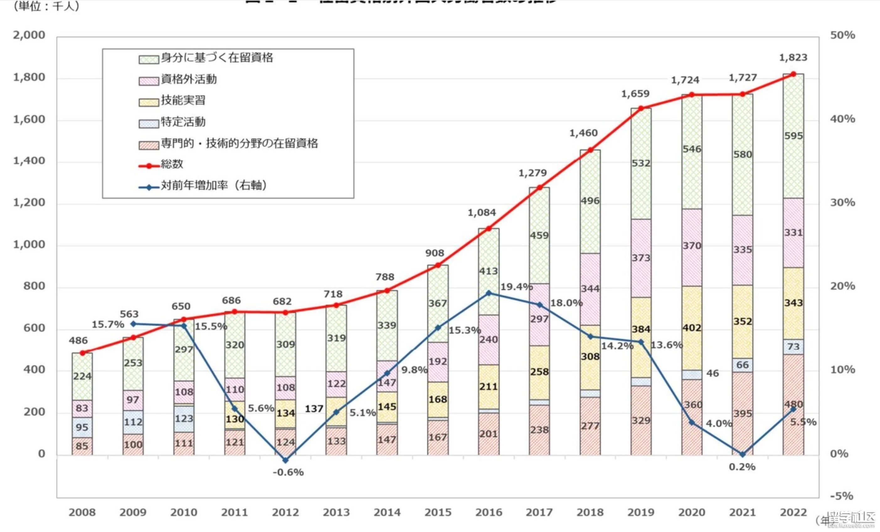 自2013年起,在日本工作的外國勞動者人數(shù)就逐年增加,只不過近幾年受疫情影響,漲幅停在了5.5%。