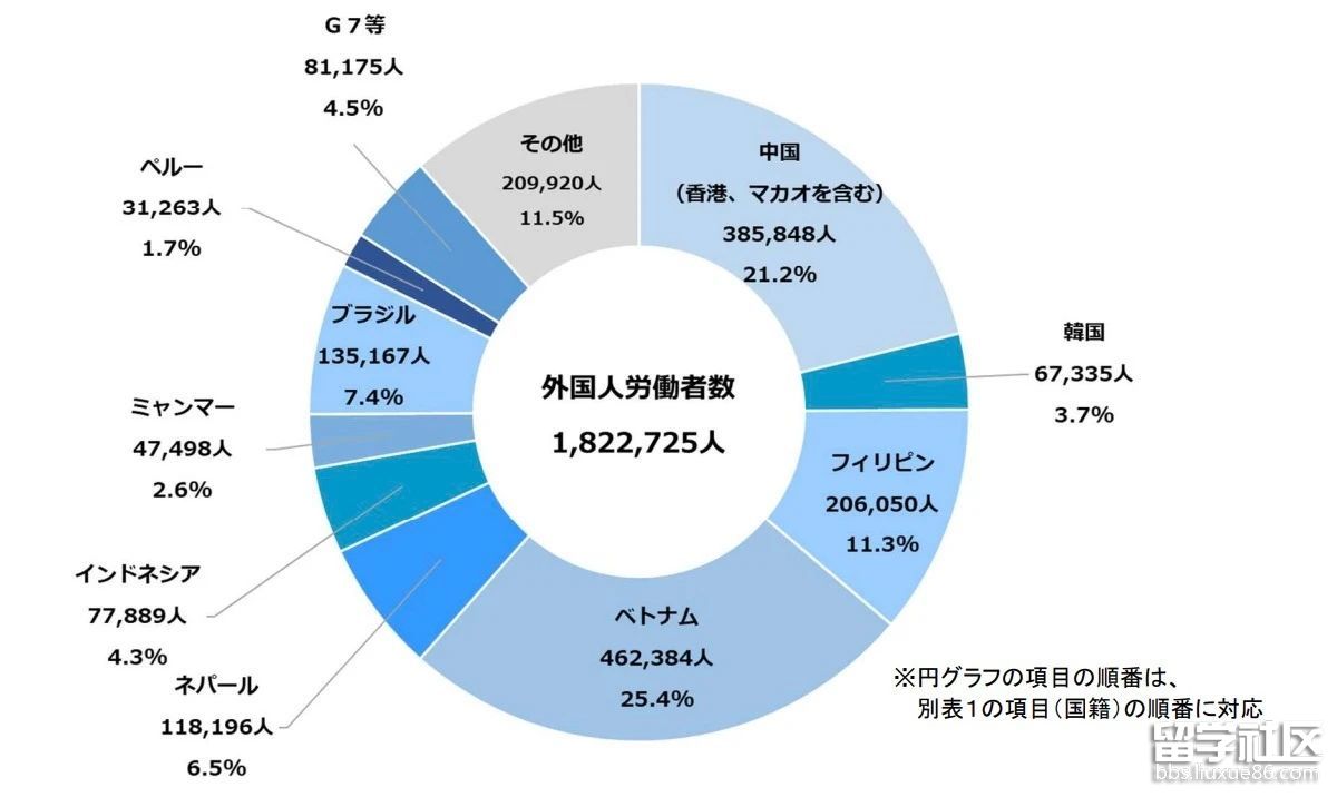 從外國勞動者的國籍來看,越南以46.2384萬人居首位。二三名分別是中國(38.5848萬人,占比21.2%)以及菲律賓(20.605萬人,占