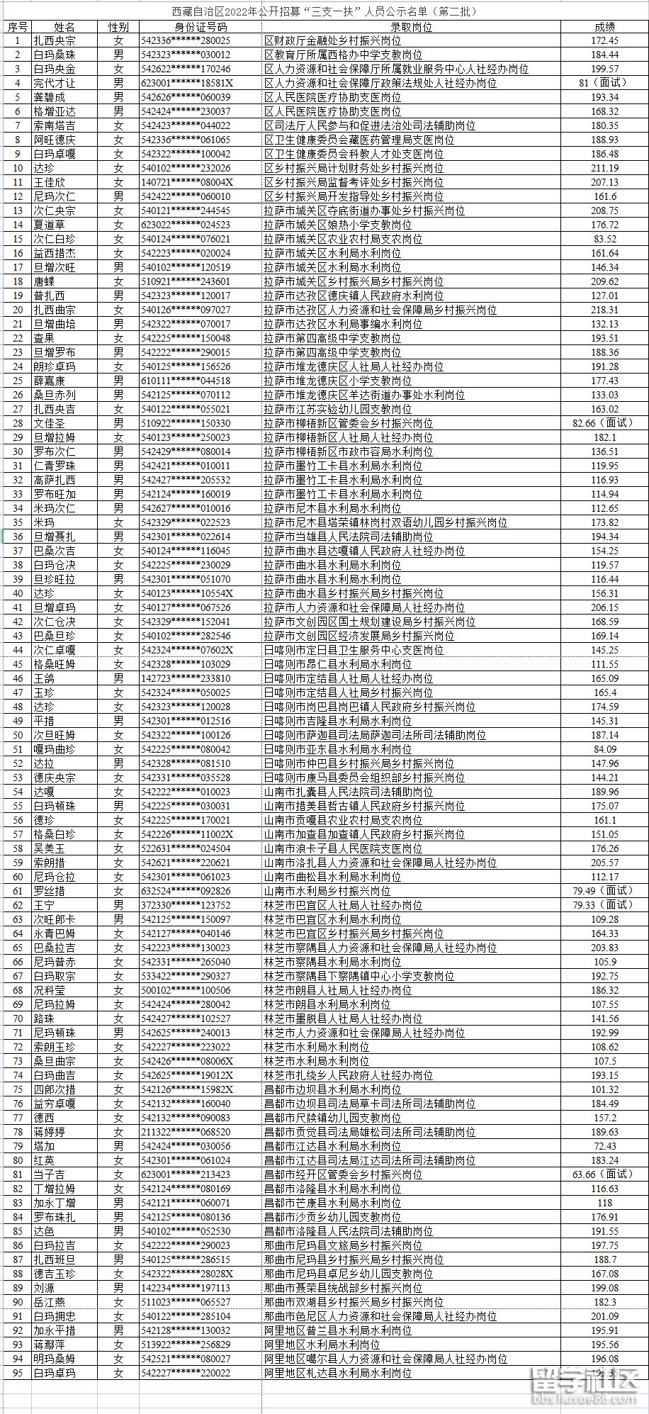 根據(jù)《關(guān)于調(diào)整西藏自治區(qū)2022年“三支一扶”人員招募工作的公告》,結(jié)合事業(yè)單位招聘結(jié)果,按照各招募崗位報名考生考試總成績從高分到低分的順序確定了第二批95個崗位擬招募人員名單。現(xiàn)將第二批擬招募人員名單進行公示,公示期為2022年11月15日—19日(共5天),如有異議,請向西藏自治區(qū)人力資源和社會保障廳反映。