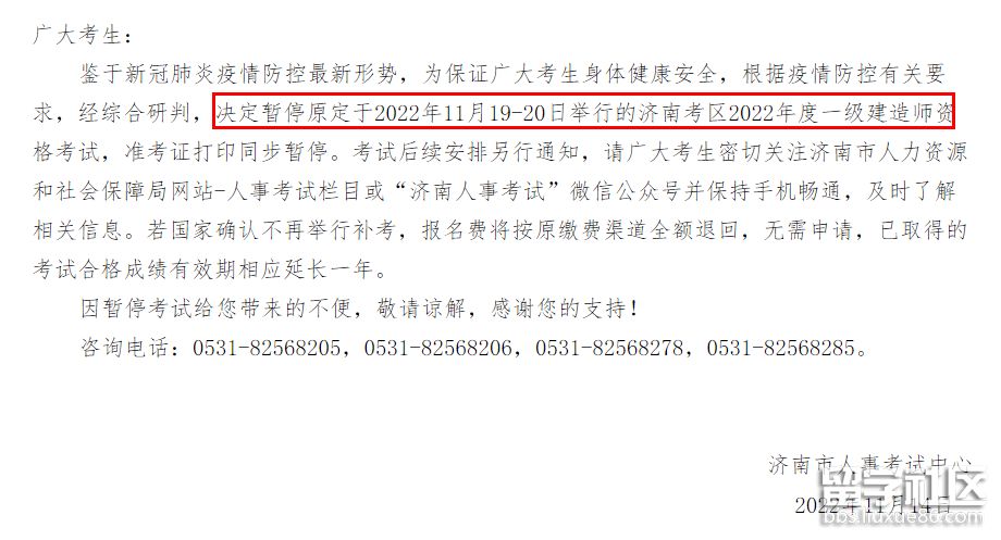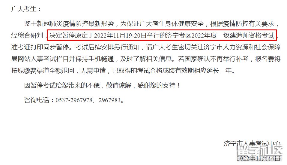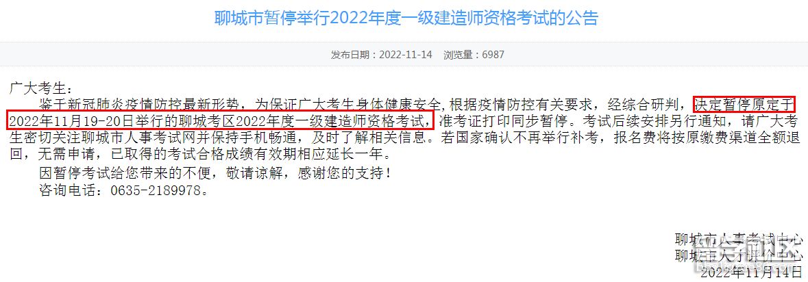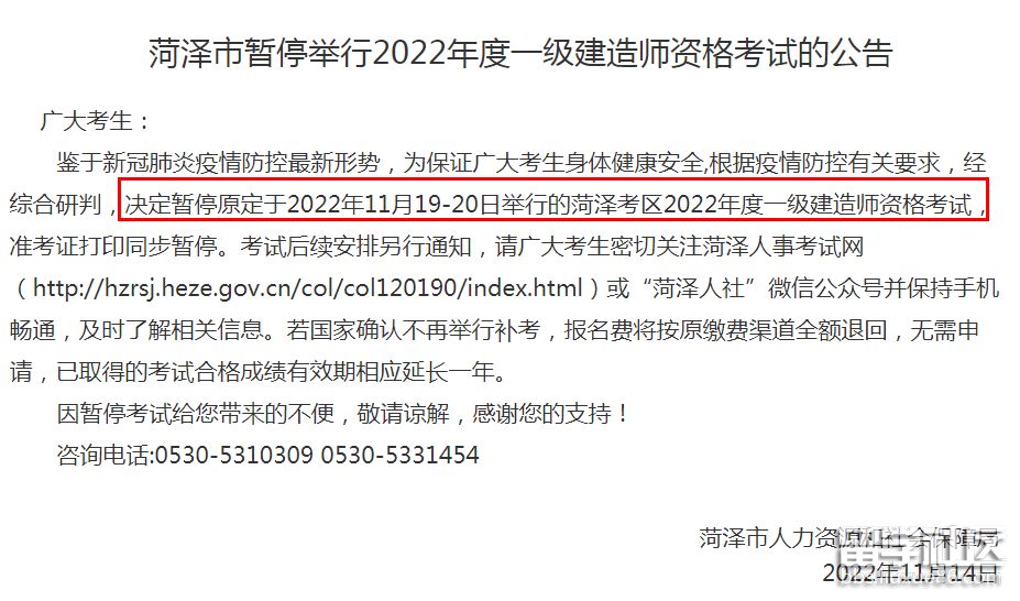 鑒于新冠肺炎疫情防控最新形勢(shì),濟(jì)南、青島、棗莊、濟(jì)寧、聊城、菏澤等市根據(jù)當(dāng)?shù)匾咔榉揽赜嘘P(guān)要求,暫停舉行本考區(qū)2022年度一級(jí)建造師資格考試,公告具體內(nèi)容如下: