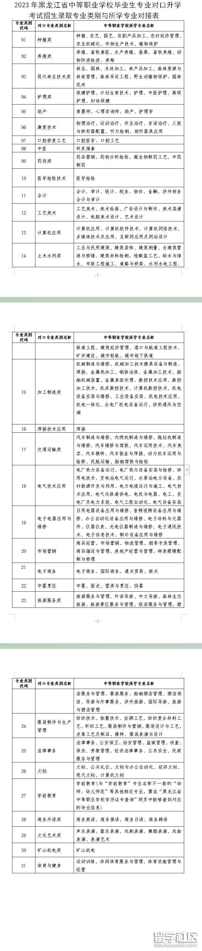 對口招生共設置31個專業(yè)類別??忌顖髮I(yè)類別原則上與中等職業(yè)學校階段所學專業(yè)嚴格對口,31個專業(yè)類別中未涵蓋的專業(yè),考生需要選報相近的專業(yè)。對口招生專業(yè)范圍見《2023年黑龍江省中等職業(yè)學校畢業(yè)生專業(yè)對口升學考試招生錄取專業(yè)類別與所學專業(yè)對接表》(附件四)。