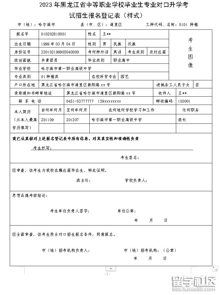 附件一:2023年黑龍江省中等職業(yè)學校畢業(yè)生專業(yè)對口升學考試招生報名登記表(樣式)