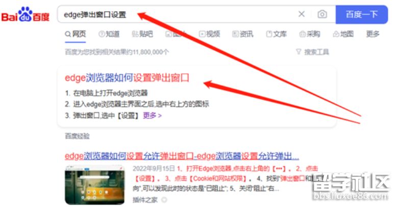 3)瀏覽器彈出窗口的設置方法,可以在百度中搜索相應內(nèi)容。比如搜索“edge彈出窗口設置”,可以搜索到“edge瀏覽器如何設置彈出窗口”頁面,如下圖: