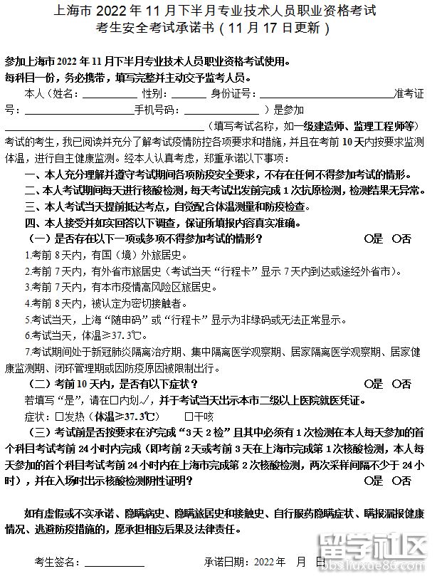 上海2022年11月下半月專業(yè)技術資格考試考生安全考試承諾書