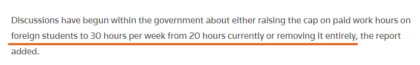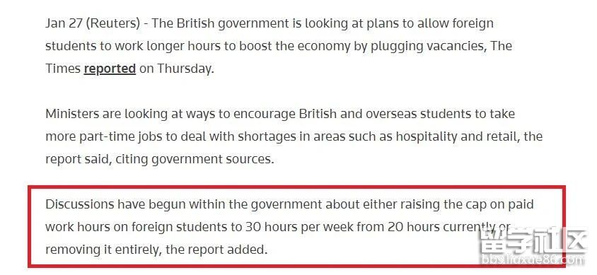 報道援引英國政府人士稱:部長們正在研究鼓勵英國和海外學生從事更多兼職工作的辦法,來應對酒店和零售等領域的短缺。同時,這篇報道還補充說,英國政府內(nèi)部已經(jīng)開始討論將外國留學生的帶薪工作時間上限從每周的20小時提高到每周30小時,或者完全取消。
