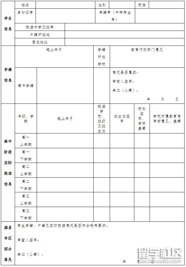 1.戶口從區(qū)外遷入我區(qū)和外來務工人員隨遷子女考生,報名時先從網(wǎng)上打印《普通高中學業(yè)水平考試戶口從區(qū)外遷入我區(qū)和外來務工人員隨遷子女考生學籍、戶籍及實際就讀情況審查表》(見附件),由就讀學校和當?shù)亟逃姓块T審核其學籍、戶籍和連續(xù)實際就讀情況。經(jīng)審核符合條件的考生,準予其進行考籍補注冊和報名;經(jīng)審核不符合條件的考生,不得參加考籍補注冊。