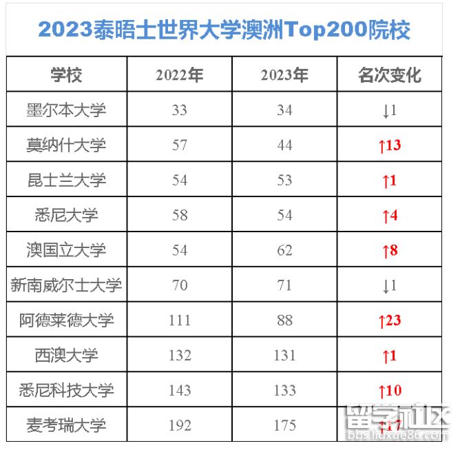 和2022年的泰晤士世界大學(xué)排名相比,澳洲各大院校整體呈現(xiàn)上升趨勢。具體看,墨爾本大學(xué)仍高居榜首,八大中的莫納什大學(xué)表現(xiàn)最為亮眼,排名直接上升13名,直追墨爾本大學(xué),阿德萊德大學(xué)上升23名,進(jìn)入全球前100~