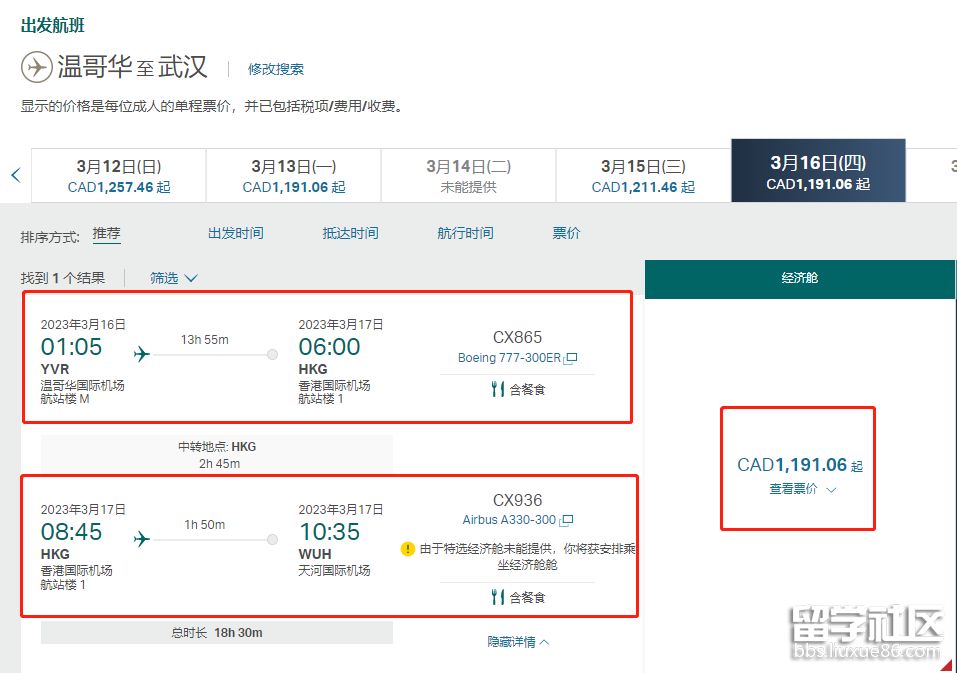 以3月16日 溫哥華=武漢行程看,乘坐國泰航空從溫哥華到香港,中間換乘時間2小時45分鐘,全程回武漢時間18.5小時,還是能接受的。目前票價最低$1,191.06加幣,比很多其它大陸航司都還便宜。