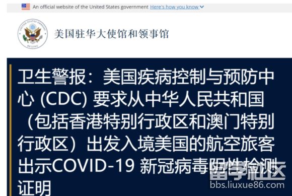 12月28日,美國(guó)疾病控制與預(yù)防中心 (CDC) 宣布:2023年1月5日起,所有2歲以上從中國(guó)(包括香港和澳門(mén)特別行政區(qū))出發(fā),入境美國(guó)的旅客,均需要出具起飛前48小時(shí)內(nèi)的新冠陰性測(cè)試結(jié)果或90天內(nèi)的新冠康復(fù)證明。