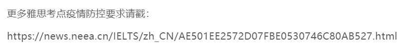 下述雅思考點不再需要提供核酸檢測陰性證明,但有其它相應(yīng)的入場要求。如果沒有按照要求來執(zhí)行,可能也會直接被拒在考場之外。希望大家認(rèn)真按照考點要求進行相應(yīng)防護。