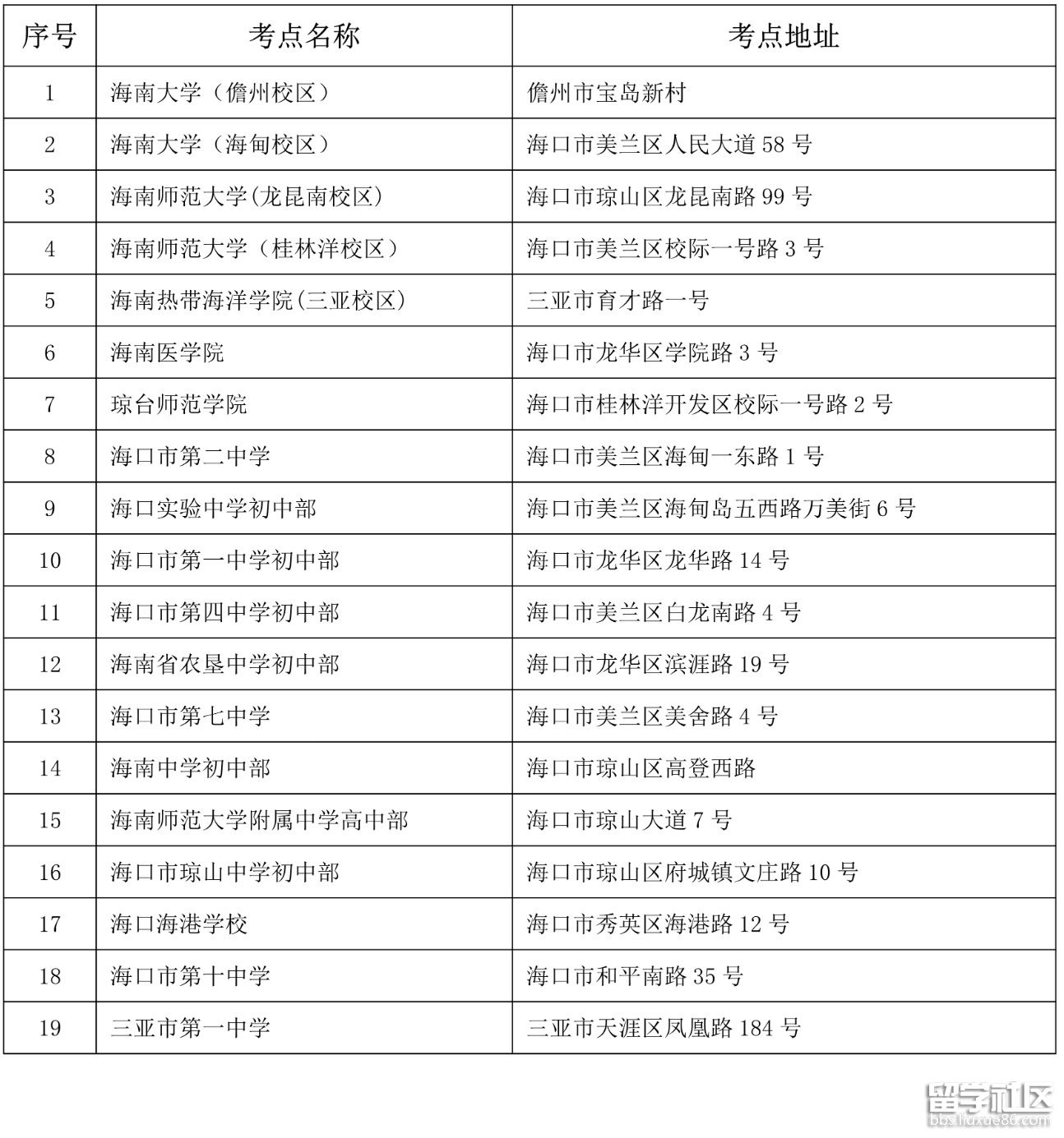 我省共設(shè)有19個考點,詳見下表: