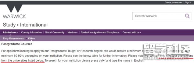 華威大學(xué)將中國院校分為4檔,對每一檔院校背景的學(xué)生分?jǐn)?shù)要求不同。僅考慮華威列出名單中的大學(xué)。其要求分?jǐn)?shù)在80%-92%不等。