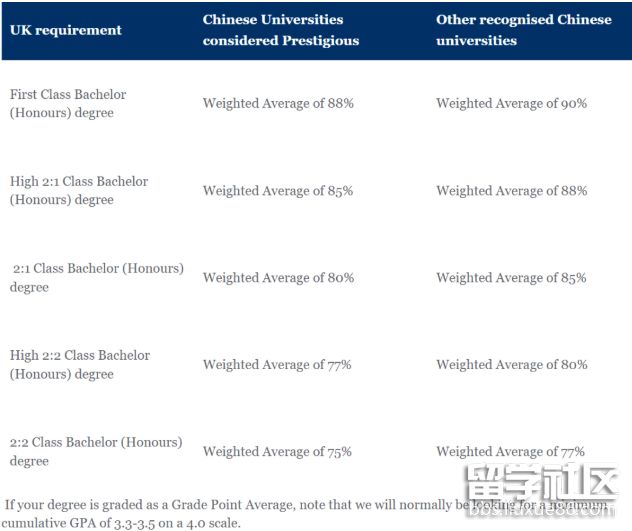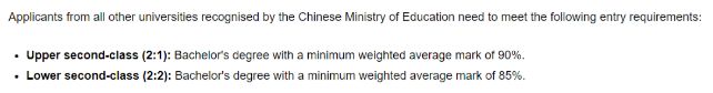 其他知名大學(xué)(非211/雙一流),對照一等學(xué)位到2:2學(xué)位分別要求均分:90%、88%、85%、80%、77%;