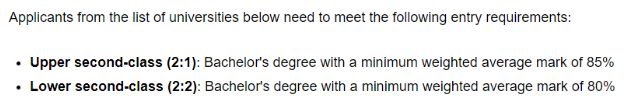 如果學(xué)生在名單中的大學(xué)完成4年制本科學(xué)習(xí),則UCL碩士專業(yè)對其成績要求為: