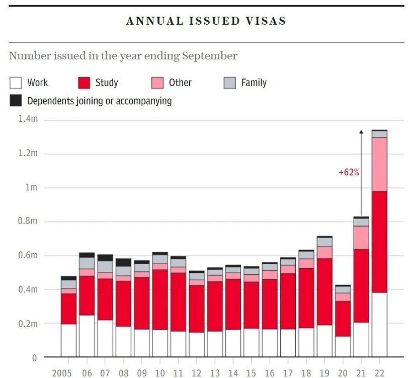 上月公布的數(shù)據(jù)顯示,截至今年6月,英國凈移入人數(shù)達(dá)到50.4萬人。這一增長(zhǎng)的部分原因是,在截至9月的一年中,學(xué)生簽證數(shù)量達(dá)到創(chuàng)紀(jì)錄的476,389份,比2019年增長(zhǎng)了77%。