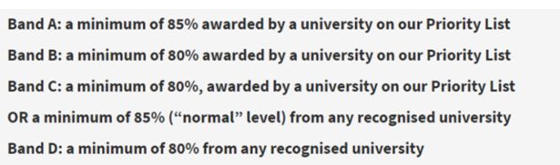 針對(duì)23年fall入學(xué)要求調(diào)整為BAND A,即優(yōu)先院校名單分?jǐn)?shù)要求85分。