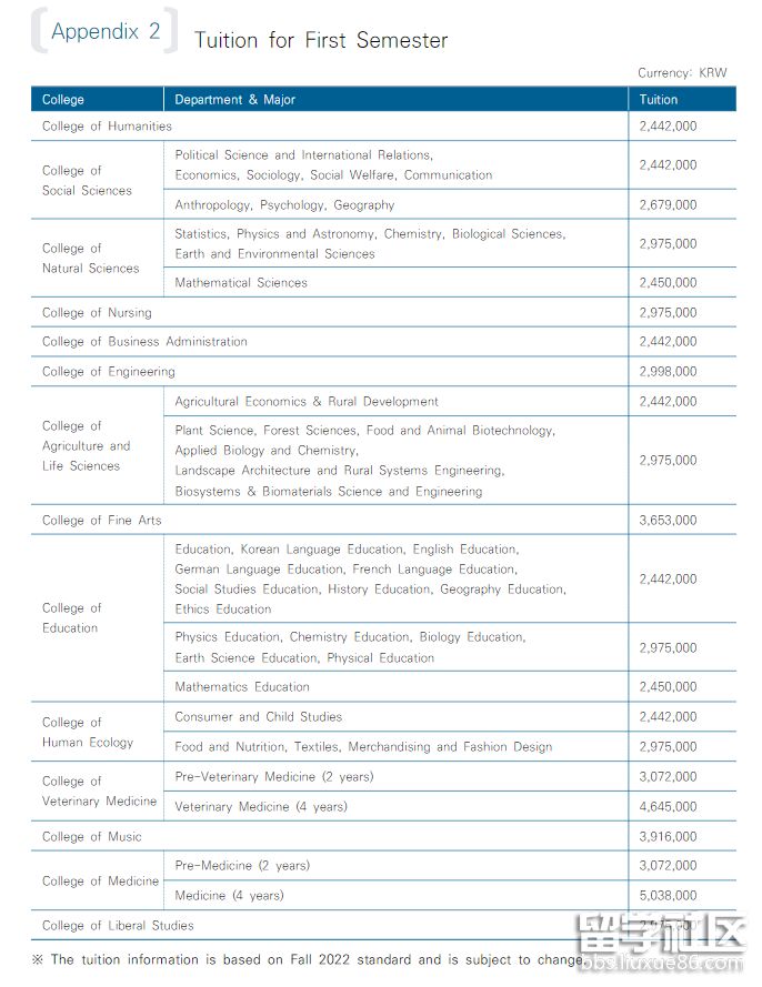 以首爾大學(xué) 2023 最新費(fèi)用為例,人文社科類專業(yè)的學(xué)費(fèi)為 2,442,000 韓元(約合人民幣 1.3 萬元),工程類專業(yè)學(xué)費(fèi)為 2,998,000 韓元(約合人民幣 1.6 萬元),藝術(shù)類專業(yè)(音樂)的學(xué)費(fèi)為 3,916,000 韓元(約合人民幣 2.15 萬元),醫(yī)學(xué)類專業(yè)則為 5,038,000 韓元(約合人民幣 2.8 萬元)。