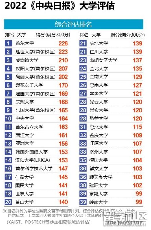 前不久,《zyrb》韓國大學(xué)排名對韓國 52 所主要大學(xué)以教學(xué)研究、教育條件、學(xué)生教育和學(xué)校聲譽(yù)四大類共 33 項(xiàng)指標(biāo)進(jìn)行評估,按照綜合得分高低進(jìn)行排名。
