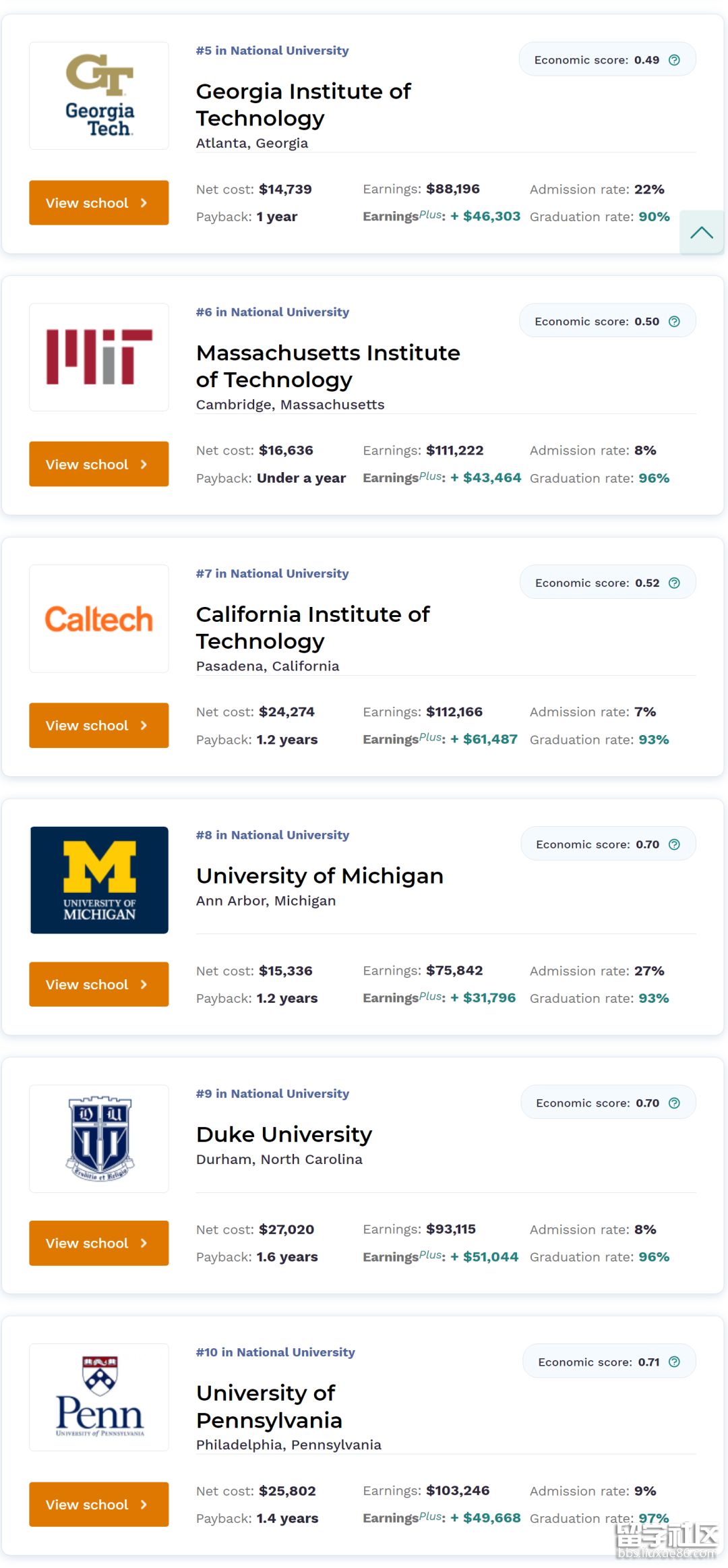 2022美國大學(xué)經(jīng)濟回報排名top10及解析