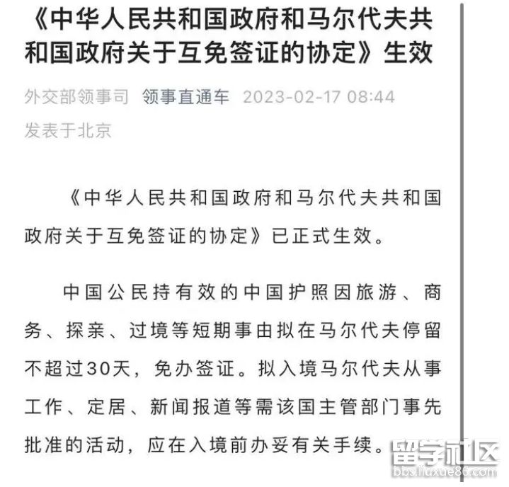 據(jù)領(lǐng)事直通車微信公眾號2月17日消息,《中華人民共和國政府和馬爾代夫共和國政府關(guān)于互免簽證的協(xié)定》已正式生效。