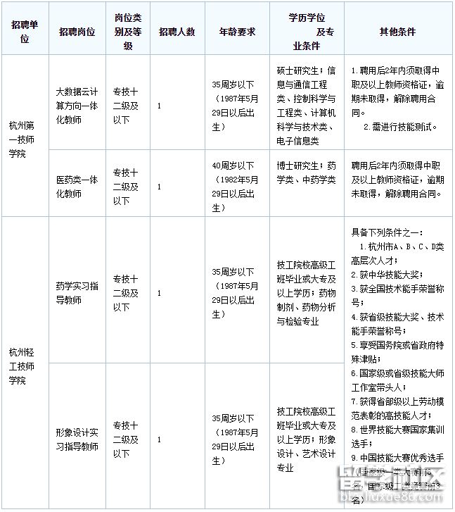 1.報名時間及報名方式:應(yīng)聘人員應(yīng)于2023年5月29日至2023年6月12日期間,通過電子郵件提交報名材料的方式進行報名,郵件主題請注明“報考單位+崗位+姓名”。報考杭州第一技師學院大數(shù)據(jù)云計算方向一體化教師崗位和杭州輕工技師學院崗位的人員填寫附件1,報考杭州市第一技師學院醫(yī)藥類一體化教師崗位的填寫附件2,報考杭州第一技師學院的人員將材料報送至hzdyjs2018@126.com,報考杭州輕工技師學院的人員將材料報送至hzqgzp@163.com。收到報名材料,郵箱會自動回復(fù)。應(yīng)聘人員應(yīng)電話確認招聘單位回復(fù)已收悉。“大數(shù)據(jù)云計算方向一體化教師”崗位報名人數(shù)不足招聘計劃數(shù)3倍的,該崗位不開考,其他3個崗位不受開考比例限制。