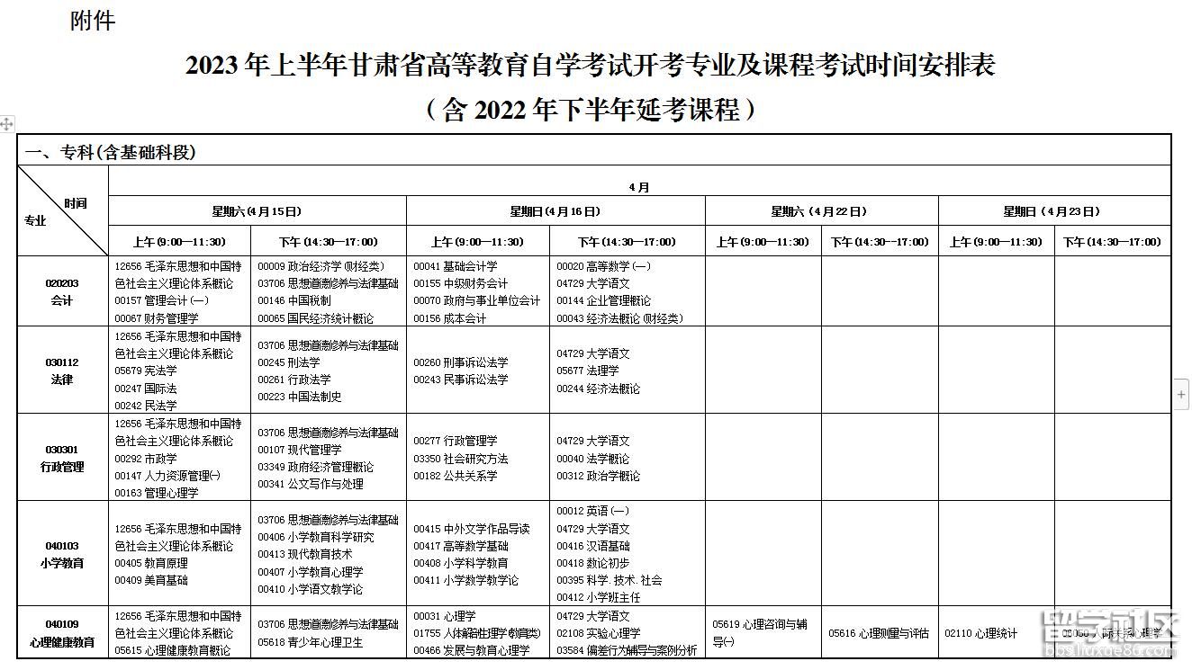 附件:2023年上半年甘肅省高等教育自學(xué)考試開考專業(yè)及課程考試時間安排(含2022年下半年延考課程)