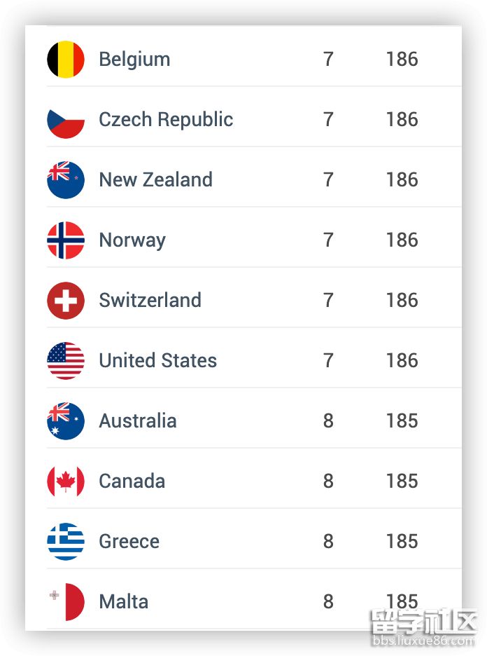 7、比利時、新西蘭、挪威、瑞士、美國、捷克----免簽186個國際目的地;