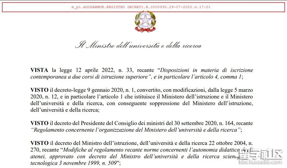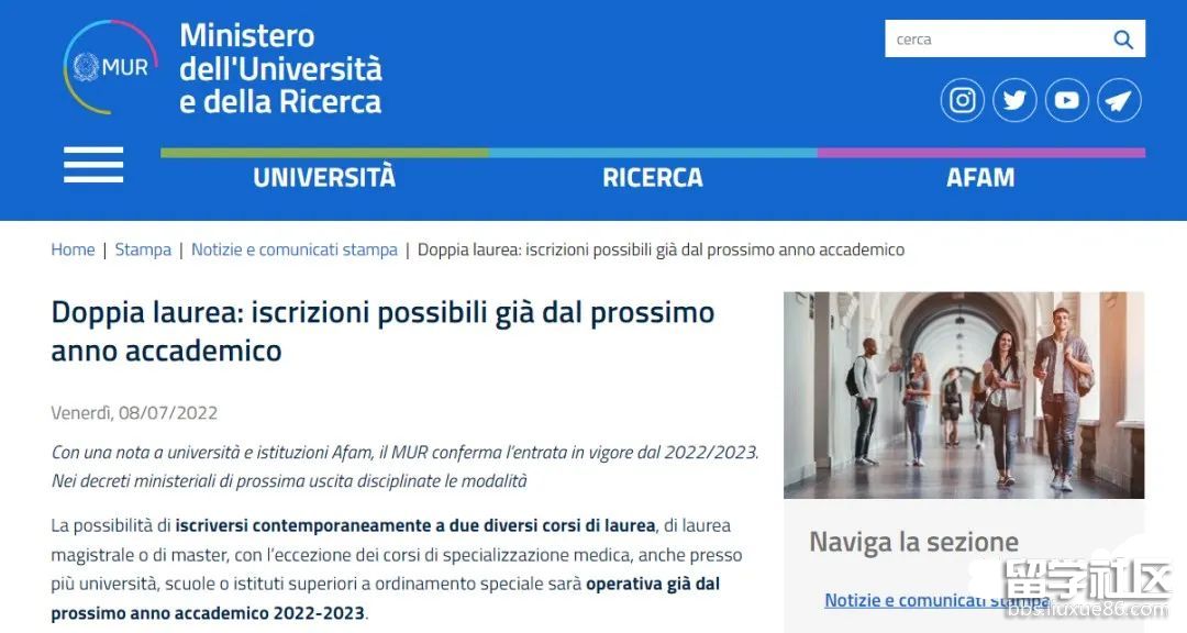 7月8日,意大利教育部正式通知意大利綜合類大學和藝術類院校的校長,宣布該法案生效,從2022/2023年開始,除了醫(yī)學類專業(yè)的學生外,其他學生都可以同時報名參加兩個不同的本科課程或碩士課程,甚至可以在不同的大學進行學習。