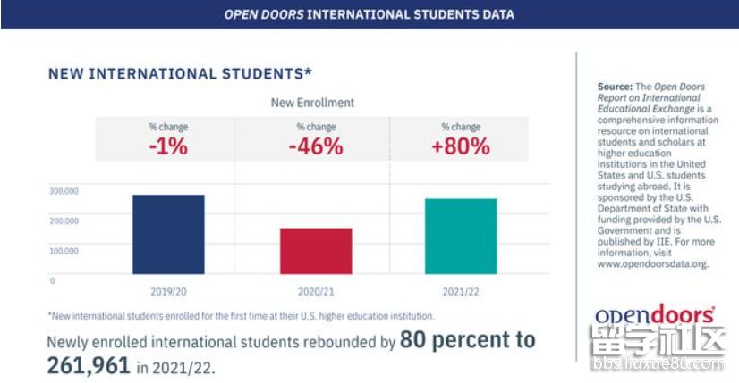 另一方面,美國國際教育協(xié)會發(fā)布了2022年度的《門戶開放報告》(Open Doors 2022 Report)。該報告由美國國務院和教育文化局和美國國際教育協(xié)會為代表,統(tǒng)計了2021/22年度美國高等教育階段的美國留學相關數(shù)據(jù)。報告中顯示,2021-2022學年,美國大學新增國際學生的數(shù)量,相對上一學年增長80%。新增的國際新生多是研究生,較上一年度增幅達到121.7%,人數(shù)達到了146,526人,為歷年研究生新生人數(shù)最高水平。