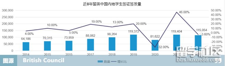 截至2022年6月的一年中,英國共發(fā)放了486,868份簽證,比2019年增加了71%。而中國留學生人數(shù)以11.5萬份學生簽證數(shù)量位列第二,占比接近四分之一。