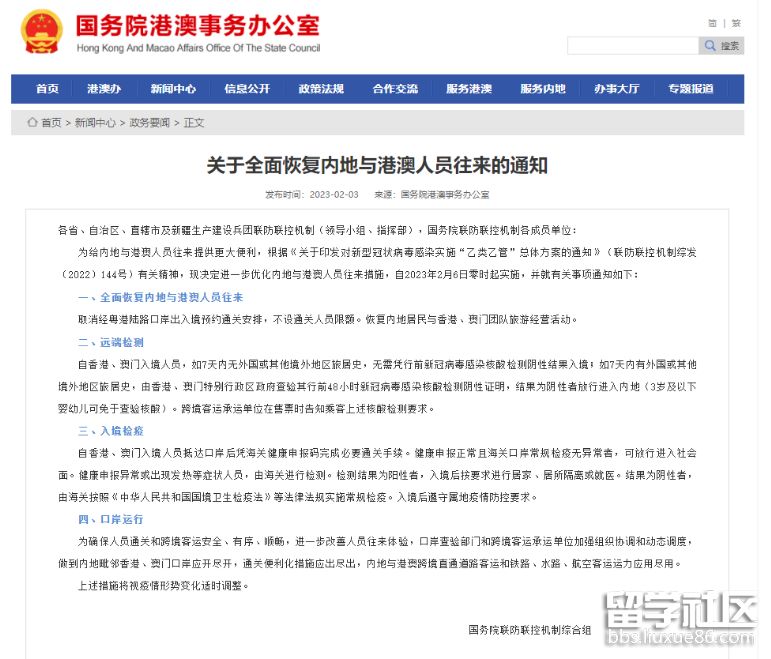在國務院港澳事務辦公室發(fā)布《關于全面恢復內地與港澳人員往來的通知》中,明確從2月6日開始,從香港或澳門入境,如果7天內沒有外國和其他境外地區(qū)旅居史,不再看核酸!也不用再預約名額,全面通關!