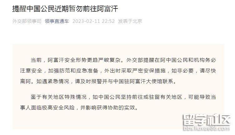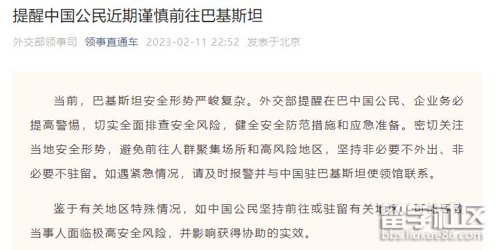 2月11日晚,“領(lǐng)事直通車”微信公眾號發(fā)布消息,提醒中國公民近期謹慎前往巴基斯坦、暫勿前往阿富汗。